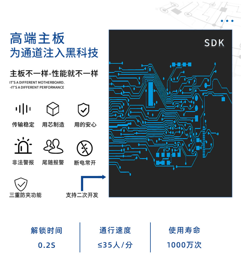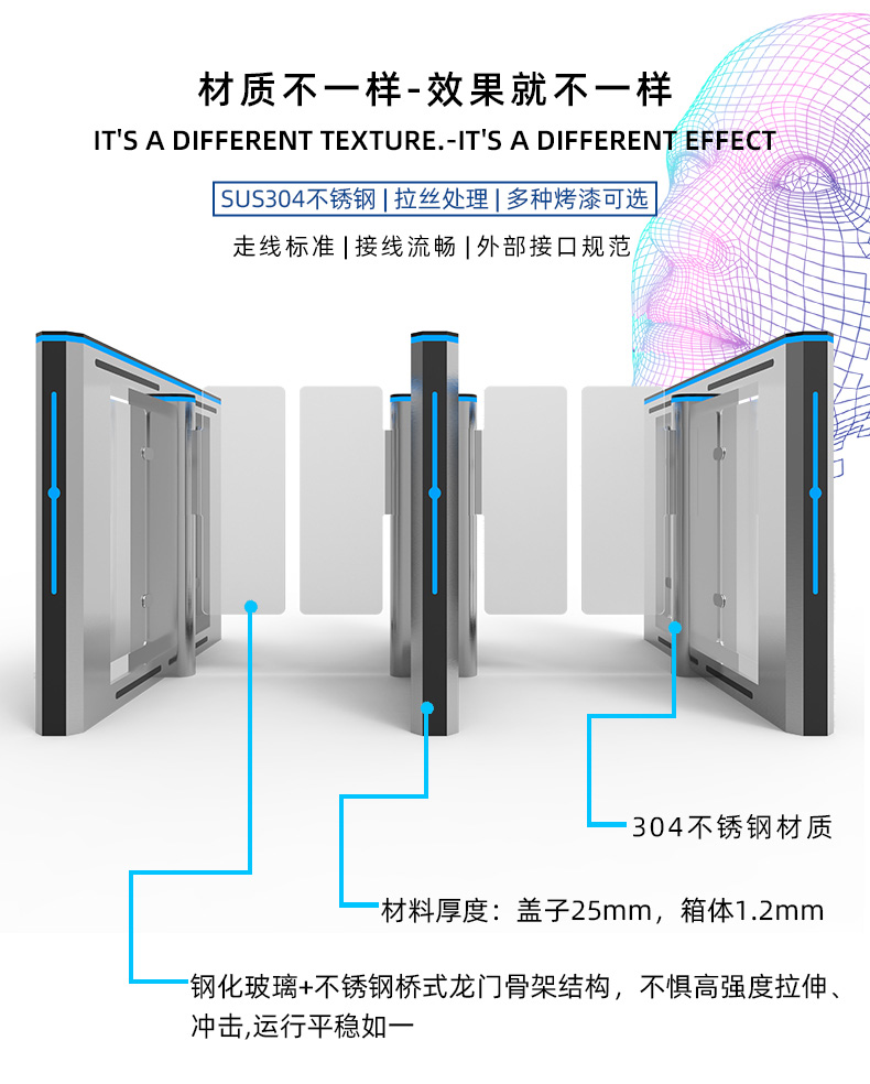 通達智速通門TDZ-B286SQ,是高端款室內速通門,機身兩側采用304不銹鋼材質加烤漆,抗銹性能強。上蓋采用黑色亞克力材質,抗指紋,不易粘塵。機身有明顯的紅藍綠燈光指示標識,能夠有效指引人員通行。多應用于大廈、寫字樓、機關單位辦公區域等地方。